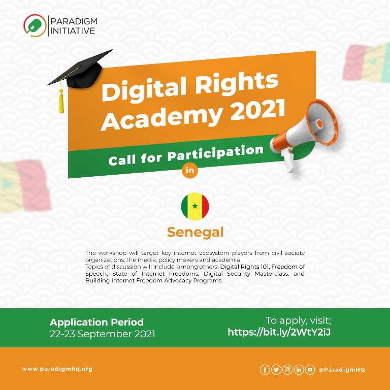Paradigm Initiative will host its annual workshop on Digital Rights dubbed ‘Digital Rights Academy’ from September 22 to 23, 2021 in Dakar, Senegal.