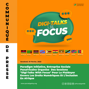 février 11, 2022 by Communications PARADIGM INITIATIVE, ENTREPRISE SOCIALE PANAFRICAINE ORGANISE DES SESSIONS « DIGI-TALKS with FOCUS » POUR LE PLAIDOYER ENVERS LES DROITS NUMÉRIQUES ET L’INCLUSION EN AFRIQUENon classifié(e)