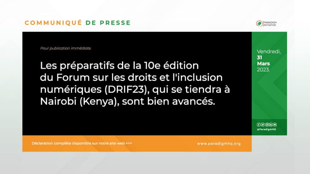 PIN, qui est une organisation panafricaine de premier plan dans le domaine des droits et de l’inclusion numériques, organise le DRIF depuis 2013. Le forum, dont le thème est « Construire un Internet durable pour tous », réunira des représentants des gouvernements, des organisations non gouvernementales, des universités, des médias, des partenaires financiers, des Nations unies, de la communauté technique et du secteur privé au sein de l’écosystème numérique.