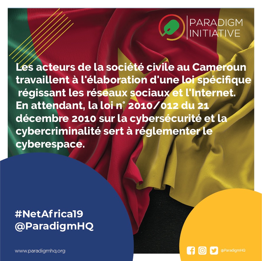 - Les acteurs de la société civile au Cameroun travaillent à l’élaboration d’une loi spécifique régissant les réseaux sociaux et l’Internet. En attendant, la loi n° 2010/012 du 21 décembre 2010 sur la cybersécurité et la cybercriminalité sert à réglementer le cyberespace. #NetAfrica19 @ParadigmHQ