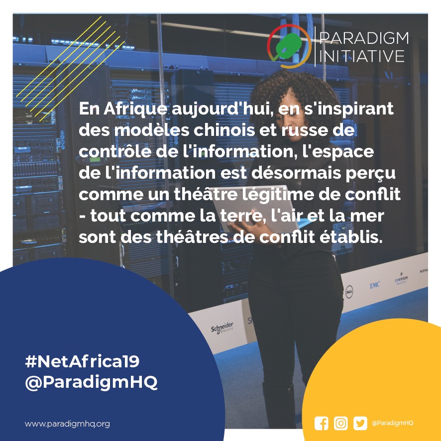 - En Afrique aujourd’hui, en s’inspirant des modèles chinois et russe de contrôle de l’information, l’espace de l’information est désormais perçu comme un théâtre légitime de conflit – tout comme la terre, l’air et la mer sont des théâtres de conflit établis. #NetAfrica19 @ParadigmHQ