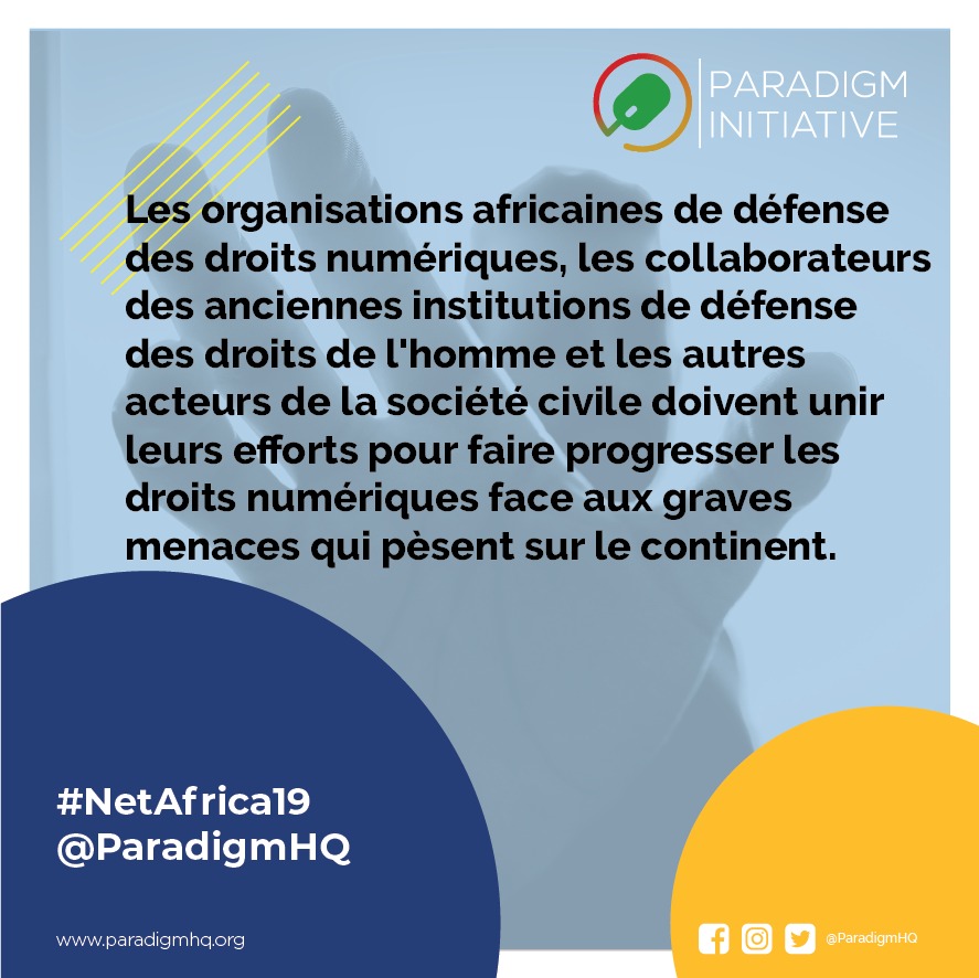 - Les organisations africaines de défense des droits numériques, les collaborateurs des anciennes institutions de défense des droits de l’homme et les autres acteurs de la société civile doivent unir leurs efforts pour faire progresser les droits numériques face aux graves menaces qui pèsent sur le continent. #NetAfrica19 @ParadigmHQ