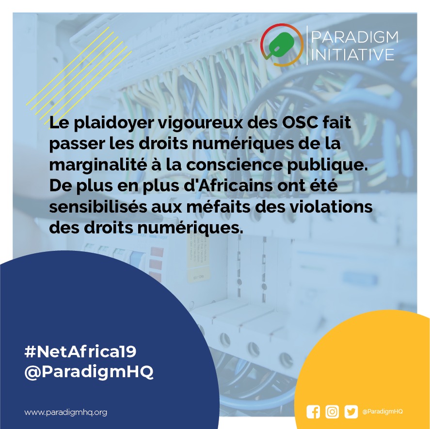 - Le plaidoyer vigoureux des OSC fait passer les droits numériques de la marginalité à la conscience publique. De plus en plus d’Africains ont été sensibilisés aux méfaits des violations des droits numériques. #NetAfrica19 @ParadigmHQ