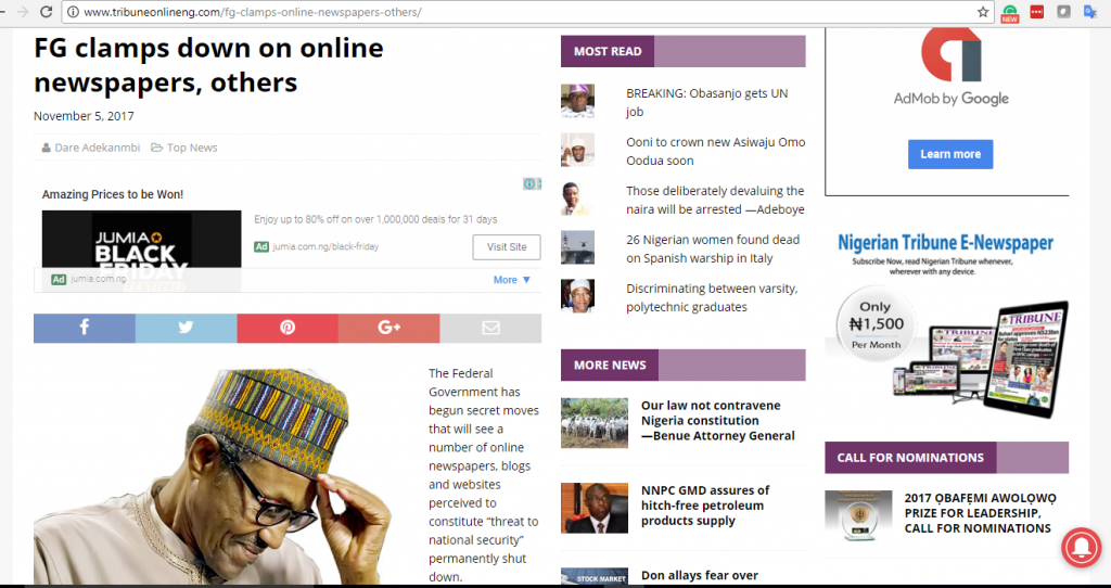 According to a report published in the Nigerian Tribune, the Federal Government is alleged to be currently carrying out this operation through the Nigerian Communications Commission (NCC), ostensibly hiding behind Section 146 of the NCC Act 2003. The section, which provides generally on the duties of a network licensee to assist the Commission in preserving national security and preventing the commission of a crime, must not be used by the Federal Government to intimidate online news providers and infringe on their rights.