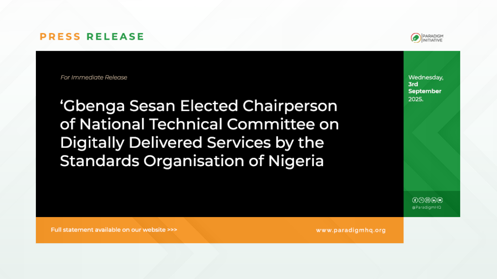Paradigm Initiative’s (PIN’s) Executive Director, ‘Gbenga Sesan, has been elected chairperson of the National Mirror/Technical Committee on Digitally Delivered Services by the Standards Organisation of Nigeria.