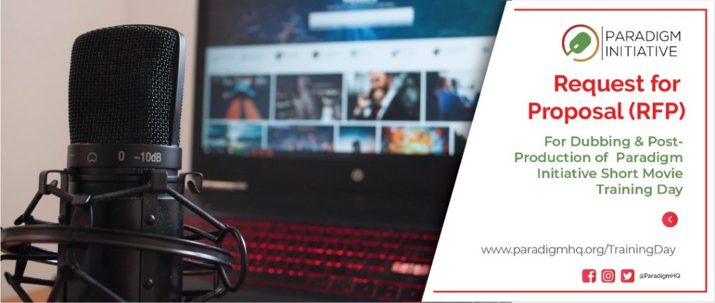Paradigm Initiative (PIN), a social enterprise advocating for digital rights and inclusion in Africa, seeks to obtain the services of professional movie producers, for the post-production (French dubbing) of our short movie, Training Day. The film is based on Paradigm Initiative’s 2019 Digital Rights in Africa report, featuring the story of a young man whose quest for work took an unexpected turn. The movie (available for free download on PIN’s website and available on YouTube) showcases the 2019 Africa Digital Rights report in a different way to resonate with a wider audience. The movie is in English, with French and English subtitles.