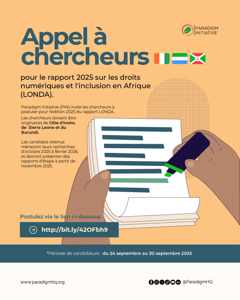 Paradigm Initiative (PIN) lance un appel à candidatures pour recruter des chercheurs en vue de l’édition 2025 du rapport LONDA. Les chercheurs recherchés doivent être originaires de la Côte d’Ivoire, de la Sierra Leone et du Burundi.