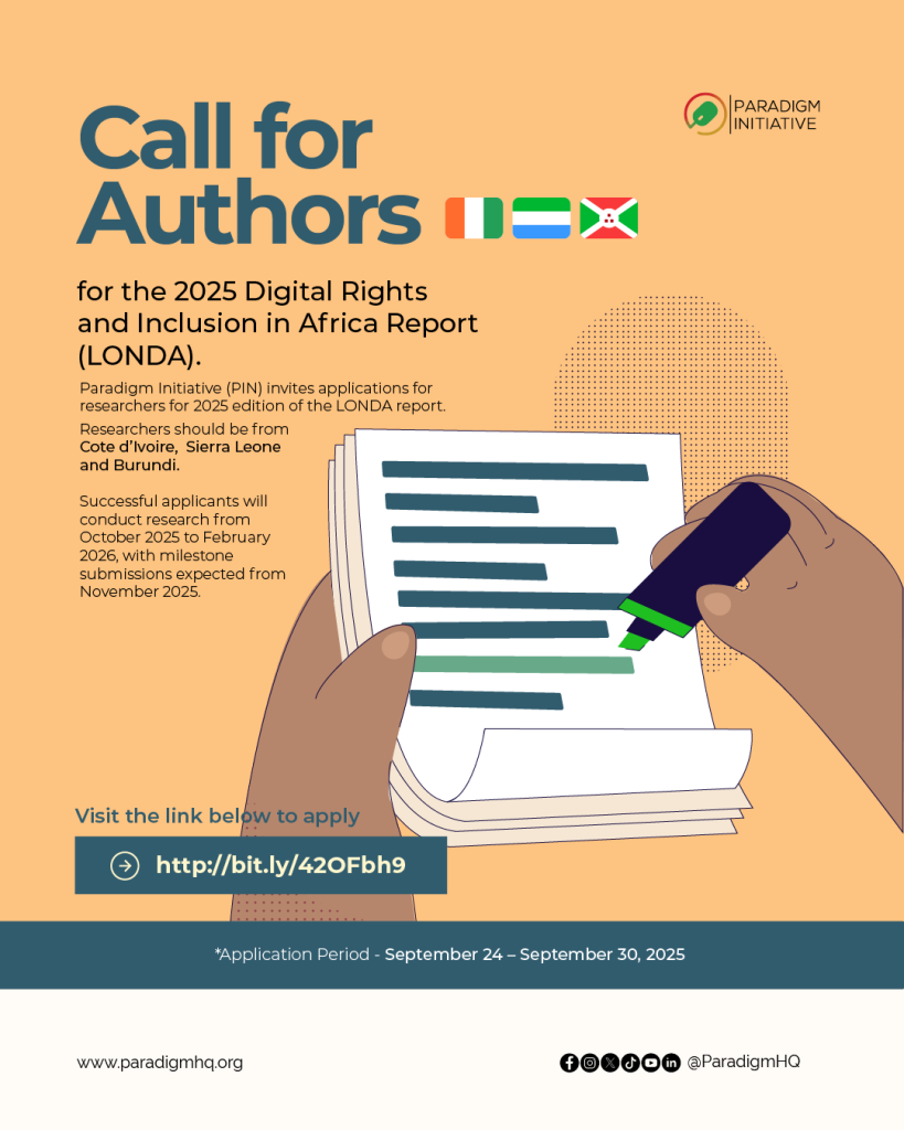 Paradigm Initiative (PIN) invites applications for researchers for the 2025 edition of the LONDA report. Researchers should be from Cote d’Ivoire, Sierra Leone and Burundi. Successful applicants will conduct research from October 2025 to February 2026, with milestone submissions expected from November 2025.