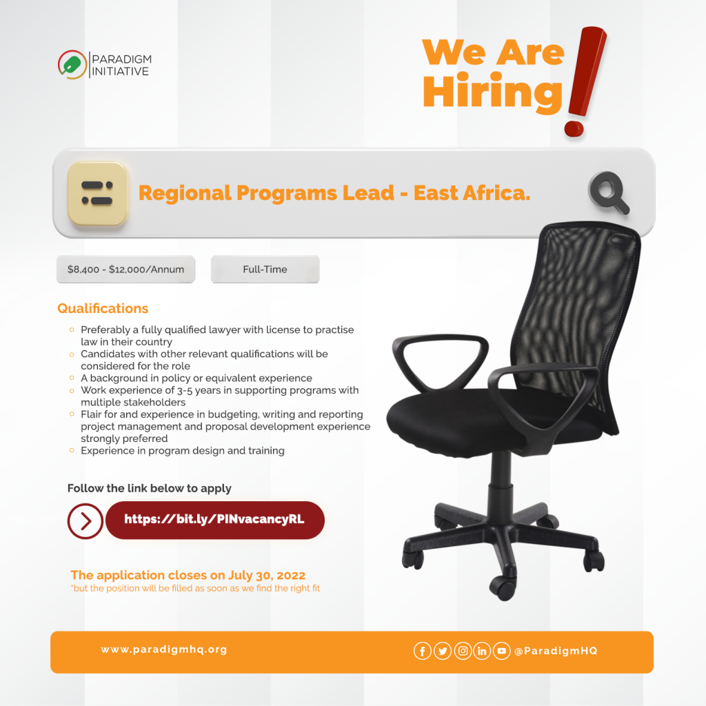 The main responsibility of a Regional lead is to oversee the development of the organization’s programs in the region under coverage. To organize, coordinate and manage programs and activities relevant to accomplishing the organization’s strategic goals and objectives, as well as to establish networks with relevant stakeholders and build and manage Paradigm Initiative’s network in the region.